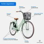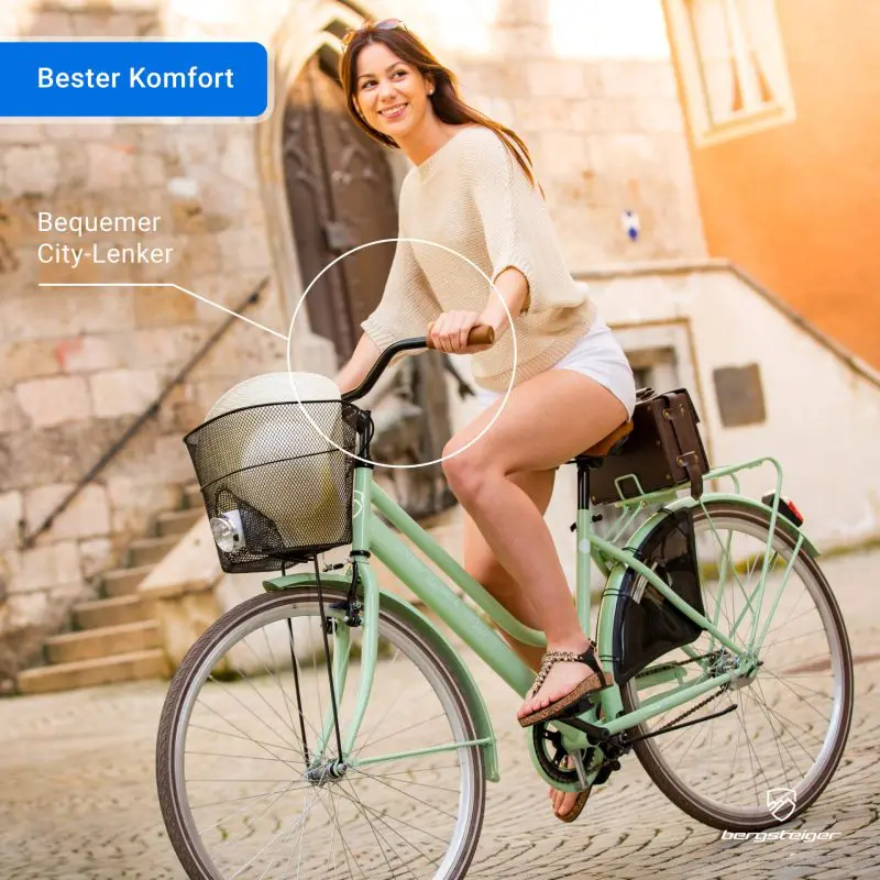 Das Fahrrad ist ein Hollandfahrrad in feschem Retro-Design. Es ist ideal für die Fahrt in der Stadt und auf dem Land geeignet.