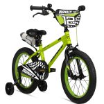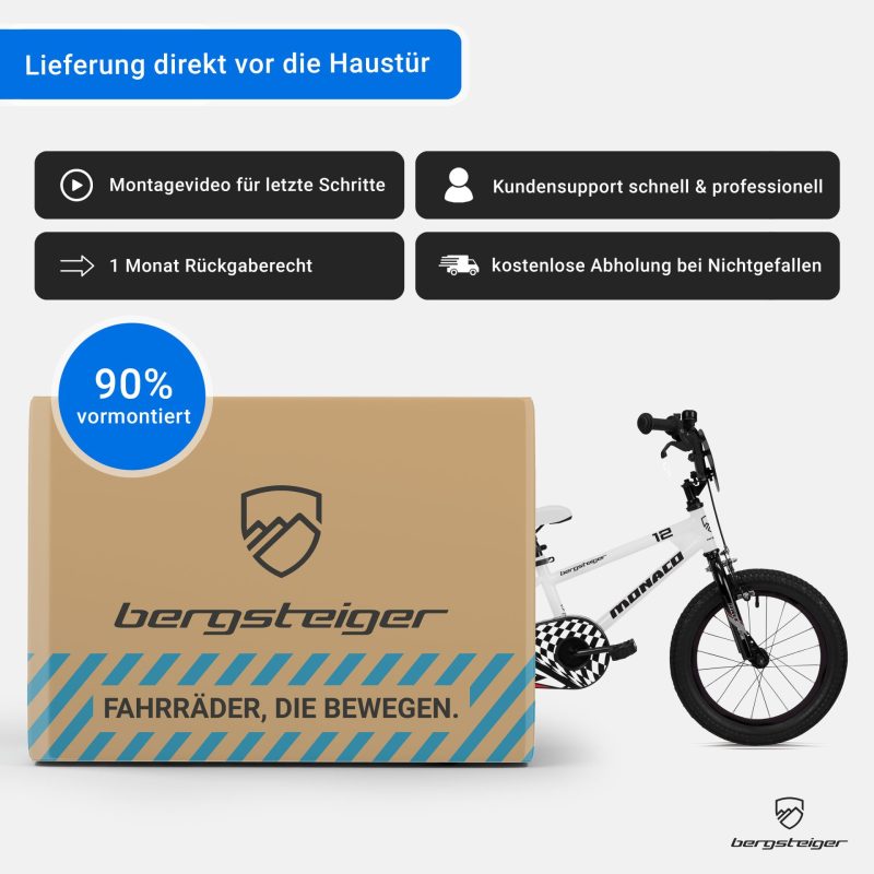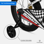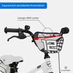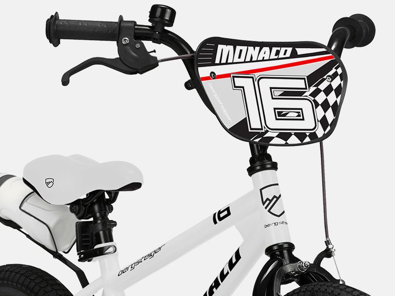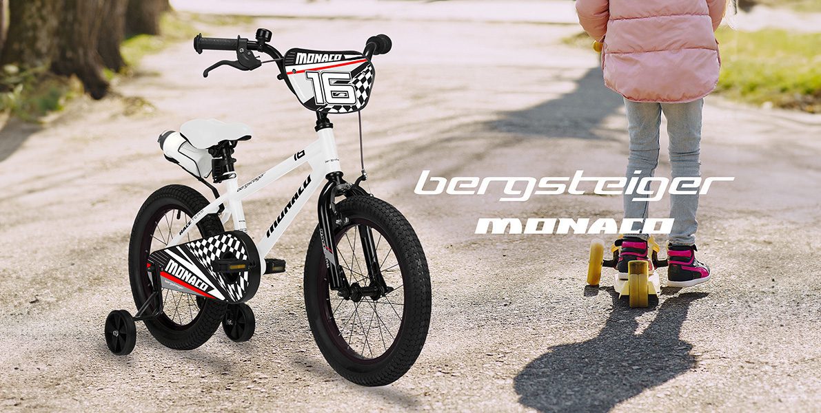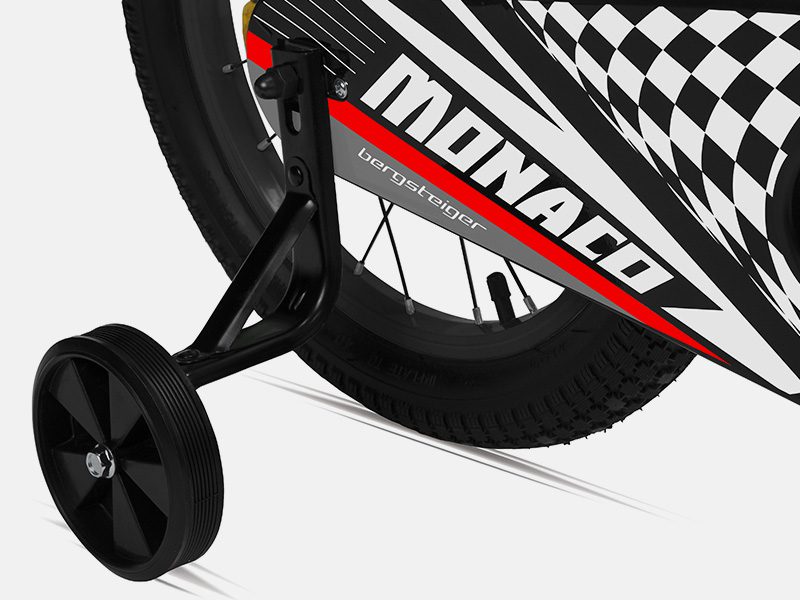Auch wenn es aussieht wie eine echte Rennmaschine: Technisch stehen beim BMX-Rad Monaco von Bergsteiger Sicherheit, Ergonomie und Fahrkomfort im Mittelpunkt. Dazu gehören auch zwei solide Stützräder, die kleine Fahranfänger vor Stürzen bewahren.